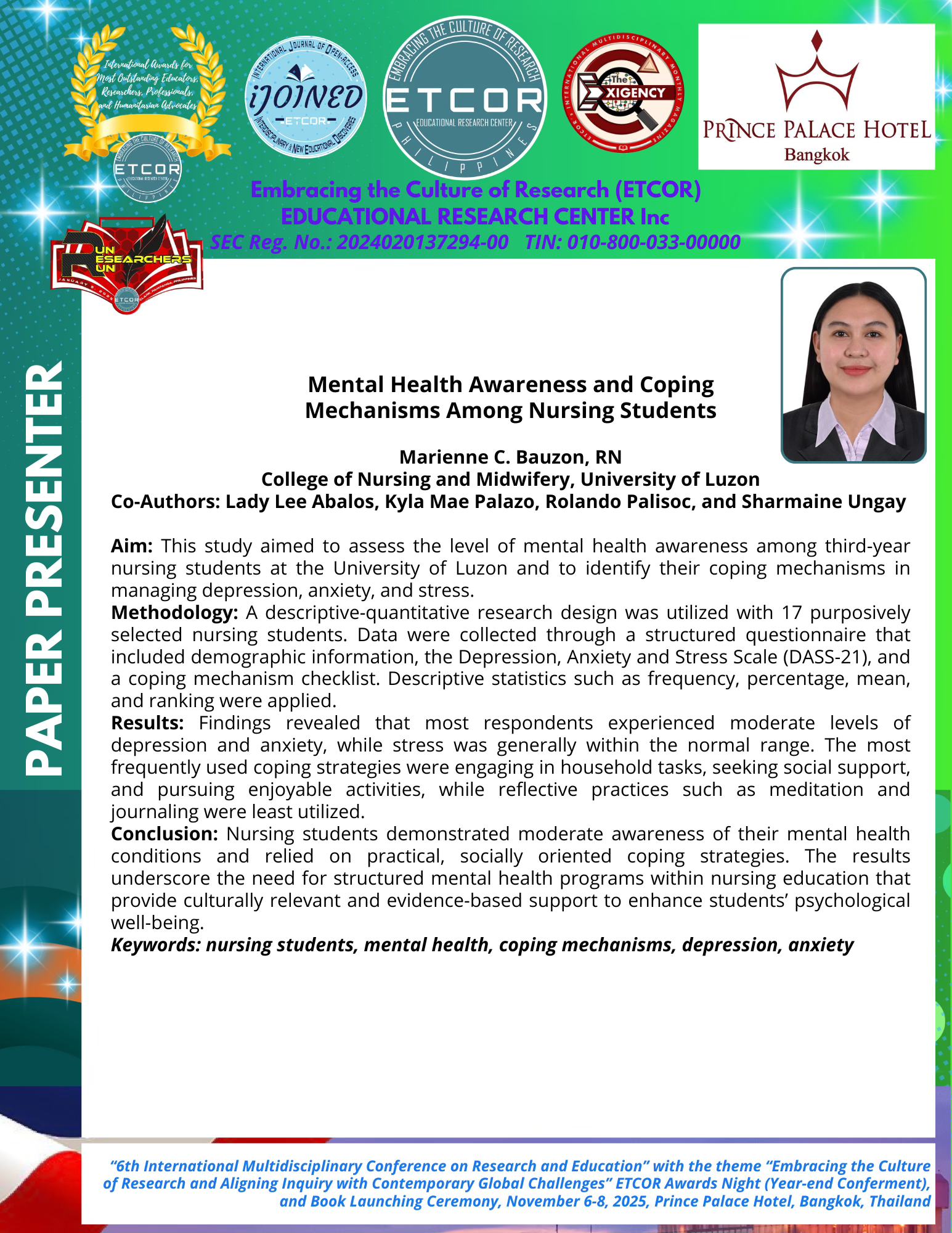 The central conclusion of the paper emphasizes that nursing students exhibit moderate mental health concerns and tend to rely on readily accessible and socially engaging strategies to cope. This outcome highlights a significant area for institutional focus: the compelling need for structured mental health programs to be integrated within the nursing education curriculum. The researchers strongly advocate that such programs must be culturally relevant and evidence-based to effectively support and enhance the students’ psychological well-being throughout their rigorous academic journey. The research presentation will be held concurrently with the ETCOR Awards Night (Year-end Conferment) and a Book Launching Ceremony, underscoring the conference’s role as a nexus for recognizing scholarly excellence and fostering intellectual contribution across multiple disciplines.