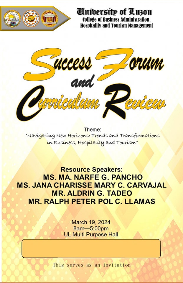 Posted on 18th of Mar 2024 by UL AdministratorThe University of Luzon’s College of Business Administration, Hospitality and Tourism Management (CBAHTM) successfully hosted a significant academic and professional development event, the “Success Forum and Curriculum Review,” on March 19, 2024, at the UL Multi-Purpose Hall. This full-day forum was designed to fortify the curriculum and provided current Luzonians with crucial insights into the dynamic shifts occurring across the business, hospitality, and tourism sectors. Operating under the theme, “Navigating New Horizons: Trends and Transformations in Business, Hospitality and Tourism,” the event underscored the University’s commitment to providing an education that was not only academically rigorous but also aligned with the immediate and future demands of global industry. This proactive approach ensured that Luzonians graduated with the competencies necessary to thrive in an increasingly complex and interconnected world.